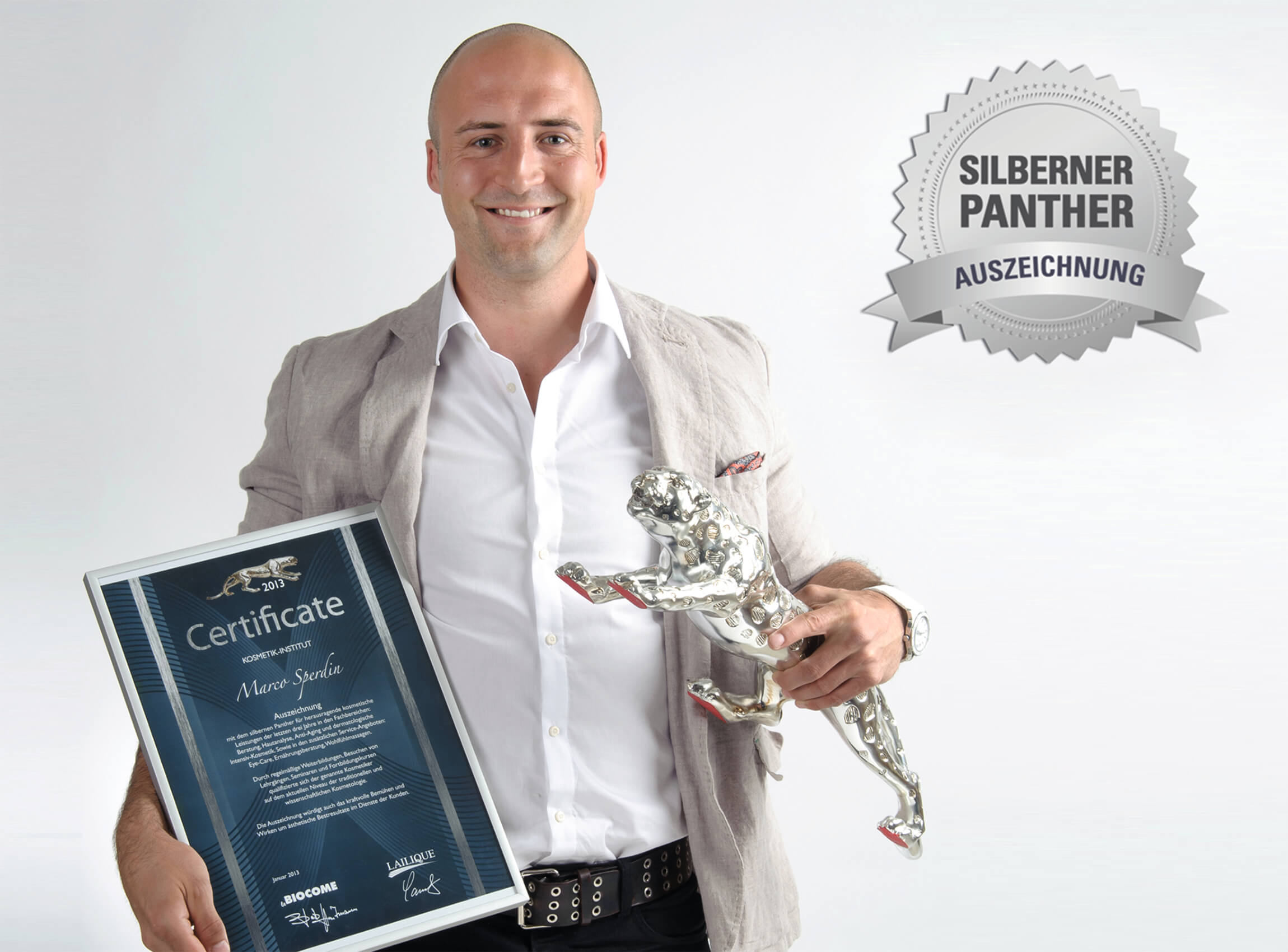 Marco Sperdin wurde mit dem Silbernen Panther ausgezeichnet für sein Können und Wissen, die Sorgfalt und Qualität seines Wirkens. Eine Auszeichnung die nur wenigen Kosmetiker zuteil wird. Nur für außergewöhnliche Leistungen im Bereich Kosmetologie.